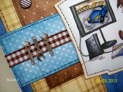 I have also added some gingham ribbon, Card Candi and brads that look like spanners.